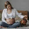 Dog laying his head on baby bump