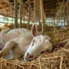 Goat napping on a bed of hay