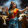 Goddess Durga, the fierce warrior goddess, rides a lion. This powerful image shows her courage and strength. The lion represents fearlessness and the ability to destroy evil. Durga riding a lion into battle reminds us that with faith and willpower, even the darkest forces can be defeated.